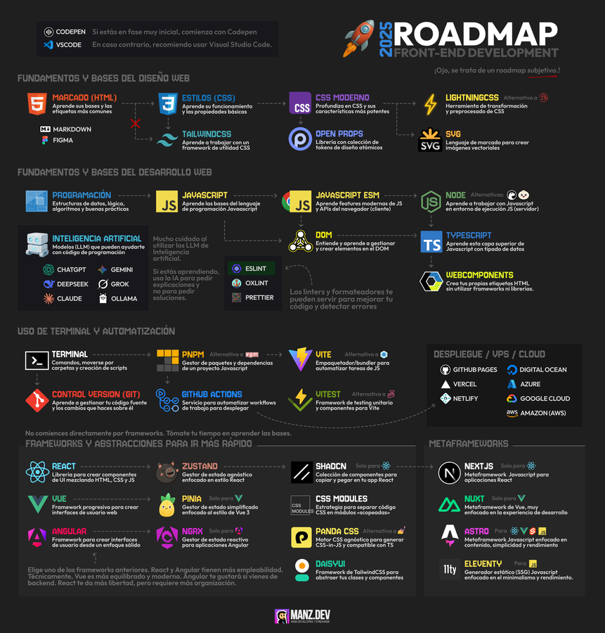 Fase 1: Fundamentos Conceptos Variables y Tipos de datos Condicionales/Bucles Funciones Clases Lo más probable es que la IA escriba el código en el futuro, pero entenderlo es imprescindible para potenciar y desbloquear limitaciones. Código cómodo: Soluciones rápidas, poco esfuerzo mental, librerías pesadas o ineficientes, dependencia, seguridad... Código eficiente: Solución optimizada, uso mínimo de recursos, trucos complejos... Código legible: Rápido de entender, lento de pensar/escribir, fácil de mantener, patrones, abstracciones... Variables: Cómo se guarda la información Variable legacy var Variable let Variable constante const Variable autocleanup using const name = "Manz"; let number = 4; name = "ManzDev"; number = 8; Primero const, en otro caso let (declarar intenciones) Comentarios Una sola línea // Multilínea /* ... */ // Un comentario de una sola linea /* Comentarios más complejos, de varias lineas. */ ¿Usarlos o no usarlos? Tipos de datos (I) Nombres de variables: Mayúsculas/Minúsculas → price y Price → Convención de nombre Tipos: Primitivos (Boolean, Number, String) y Civilizados Primitivos especiales: undefined, null Avanzado: Symbol const isOpen = true; // true o false const price = 50.25; // enteros o decimales const name = "ManzDev"; // textos (carácteres o cadenas de texto) let empty; // undefined const userInRoom = null; // ausencia (intencional) const start = Symbol("start"); // valores únicos (identificadores) const global = Symbol.for("start"); // valores globales Tipos de datos (II) Números grandes: BigInt Valor no representable numéricamente: NaN → Meme JS const number = 12345678901234561; number === 12345678901234561 // true number === 12345678901234560 // true number === 12345678901234558 // true const bigNumber = 12345678901234561n; 100000000000000000 + 100000000000000005 // Pierde precisión 100000000000000000n + 100000000000000005n // OK (pero tienes que trabajar en BigInt) const number = 4 - "hola"; // NaN (Not a Number) Number("35"); // 35 (es número) Number("DHardySD"); // NaN (Not a Number) String(4); // "4" (es texto) Number.parseInt("35€"); // 35 (es número) Number.parseFloat("35.5€"); // 35.5 (es número) Tipos de datos (III) Colecciones básicas: Array, Object Colecciones mejoradas: Map, Set (ahora no es importante) Otros: Date → Temporal, RegExp... (más adelante) → Estructuras avanzadas → Post // Array const numbers = [1, 5, 10, 15, 20]; // Objeto const object = { name: "ManzDev", life: 95, numbers: [1, 5, 10, 15, 20] } // Conjunto (no repetidos) const set = new Set([ 1, 5, 10, 15 ]); // Mapa const map = new Map([ ["name", "Manz"], ["life", 95] ]); // ~ map = new Map(Object.entries(object)); Ámbitos Ámbito global (en todo el código) Ámbito local (en una zona concreta) const name = "ManzDev"; // existe aquí // ... // y aquí // ... // ... // y aquí // aquí no existe aún { const name = "ManzDev"; // aquí existe // ... // y aquí } // pero aquí no Condicionales y bucles Condicionales (I) if ... else ... ? ... : ... (operador ternario) → Operadores básicos y de comparación const number = 3; if (number < 5) { console.log("Malo"); } else { console.log("Bueno"); } const value = number < 5 ? "Malo" : "Bueno"; // Ternarios encadenados const value = number < 5 ? "Malo" : number == 5 ? "Decente" : "Bueno"; ¡Puedes hacerlo simple o encadenarlos! Condicionales (II) switch ... case: ... default: ... (valores concretos) Usar diccionarios (avanzado, para los que ya saben) const number = 1; switch (number) { case 1: console.log("Muy malo"); break; ... default: console.log("Valor no identificado"); break; } const number = 1; const dictionary = { 1: "Muy malo", 2: "Malo", 3: "Normal", } const value = dictionary[number]; Bucles (I) Inicialización, condición e incremento Concepto de iteraciones (bucle) let number = 5; // Inicialización while (number > 0) { // Condición console.log(number); number--; // Incremento } let number = 0; do { console.log(number); number--; } while (number > 0); ¿El bucle muestra el 0? Bucles (II) Inicialización, condición e incremento en misma línea Concepto de iteraciones (bucle) // for(ini, cond, incr) for (let number = 0; number <= 5; number++) { console.log("Number vale: ", number); } // Posición 0 1 2 3 4 5 const elements = [25, 20, 15, 10, 5, 1]; for (index in elements) { console.log(index); // index (0, 1, 2...) } for (number of elements) { console.log(number); // valor (25, 20...) } Funciones (I) Simplificar Modularizar código (reutilizar) console.log("Titular ------------"); console.log("Descripción de texto"); console.log("Titular ------------"); console.log("Descripción de texto"); // ... function mostrar() { console.log("Titular ------------"); console.log("Descripción de texto"); } mostrar(); // for (let i=0; i < 5; i++) mostrar(); // mostrar(); Funciones (II) Parámetros / Argumentos Devolución de datos con return // Parámetros function mostrar(title, description = "--") { console.log(title + " ------------"); console.log(description); return 42; } const name = "ManzDev"; const description = "Es un streamer"; const output = mostrar(name, description); // Argumentos mostrar("ManzDev", "Streamer"); mostrar("Felixicaza", "Moderador"); mostrar("Krepssi", "Moderadora"); mostrar("DHardySD"); Funciones (III) Función tradicional function name() { ... } Función anónima function() { ... } Función flecha ( Fat arrow ) () => { ... } (diferencia clave: this, lo veremos más adelante) function name(a, b) { /* ... */ } function (a, b) { /* ... */ } const name = function (a, b) { /* ... */ } const name = (a, b) => { /* ... */ return 42; } const name = (a, b) => { /* ... */ } // return directo const name = (a, b) => 42; Clases Clases (I) Organización de variables y funciones en una entidad Propiedades (variables) y Métodos (funciones) class Human { name = "NPC"; height = 185; x = 0; walk() { this.x = this.x + 25; } } const npc = new Human(); // Crear humano const manz =